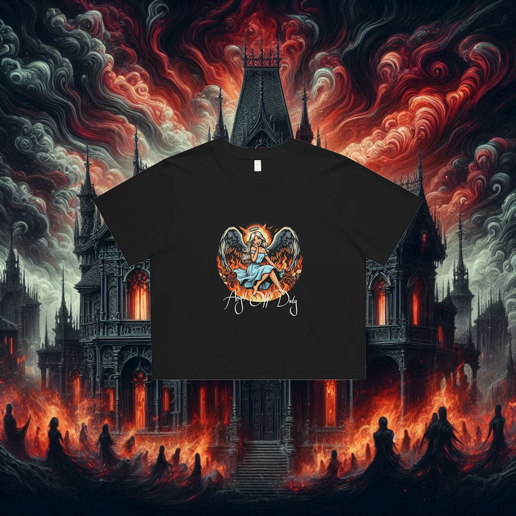 Even the purest souls need a break—and when they do, they party in hell. The Angel Off Duty Crop Top features playful clipart-style art of a relaxed angel kicking back in the underworld, with the words “angel off duty” stamped underneath in a devilishly cute font.
